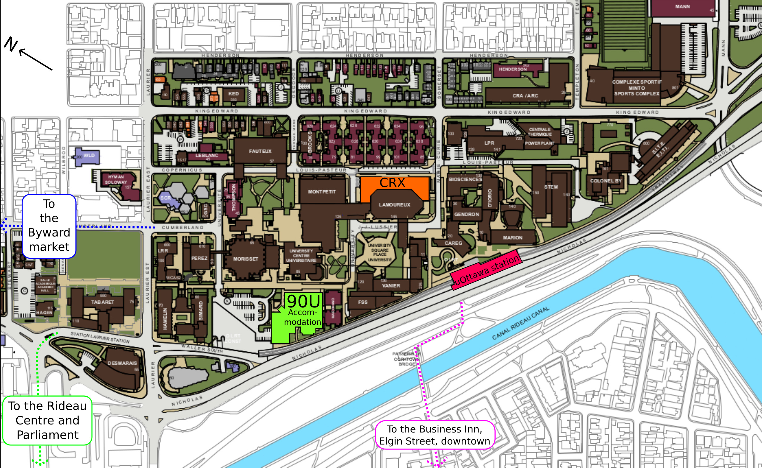 Byward Market. This is slightly north of the university, about a 15 minute walk. There are many restaurants, bars, and shops. This area is fairly touristy.